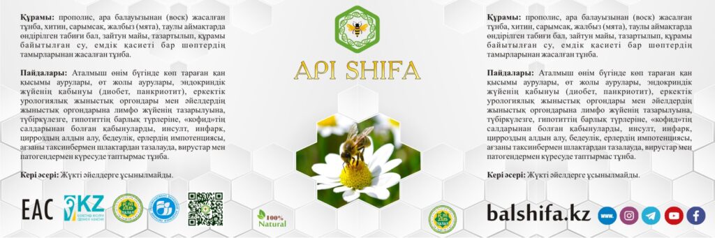 Құрамы: прополис, ара балауызынан (воск) жасалған тұнба, хитин, сарымсақ, жалбыз (мята), таулы аймақтарда өндірілген табиғи бал, зәйтүн майы, құрамы байытылып, тазартылған су, емдік қасиеті бар шөптердің тамырларынан жасалған тұнба.